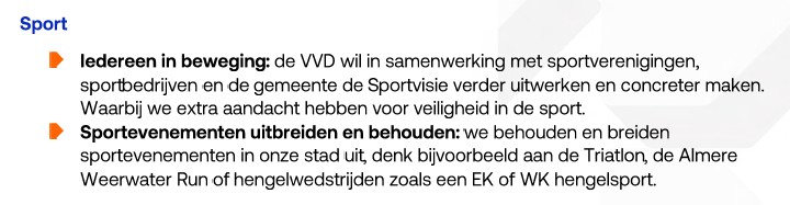 De VVD is een partij die zich bij de debatten over de Nota Dieren onomwonden voor de hengelsport in Almere heeft ingezet. Gelukkig blijven zij de onzinnigheid van hengelsportvrije gebieden ter discussie stellen. In het verkiezingsprogramma van de VVD wordt het stimuleren van de hengelsport zelfs genoemd, ook dat is mooi.