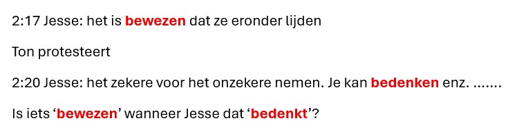 Stuitend toch weer de stelligheid waarmee wethouder Jesse beweert dat het lijden van vissen bewezen is (of toch misschien niet, dus eigenlijk kletst hij maar wat. Luister zelf vanaf 2:18) terwijl ze bij de PvdD nooit verder komen dan wat documentjes vol meningen en gekleurde aannames. Vermoeiend ook met zijn opmerkingen over “zielige visjes die niet kunnen gillen” en zijn “opkomen voor de natuur”. In plaats van effectief beleid hoor je slechts selectieve verontwaardiging en goedkope retoriek. Een PvdD hoort met zijn dogma’s niet thuis in een gemeenteraad, laat staan in een coalitie!